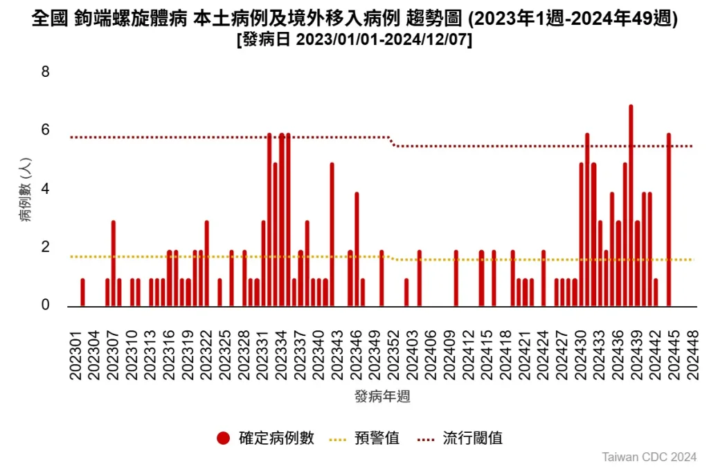鉤端螺旋體病在台灣表現出明顯的季節性流行特徵,尤其是在夏季高降雨週期。根據2023年第1週至2024年第49週的病例數據顯示,2023年的高峰期集中於第33至第36週(8月中旬至9月上旬),每週台灣民眾確診病例數達到5至6例,而2024年的高峰期則在第39週(9月底至10月初)達到7例,呈現出季節性傳播的趨勢。